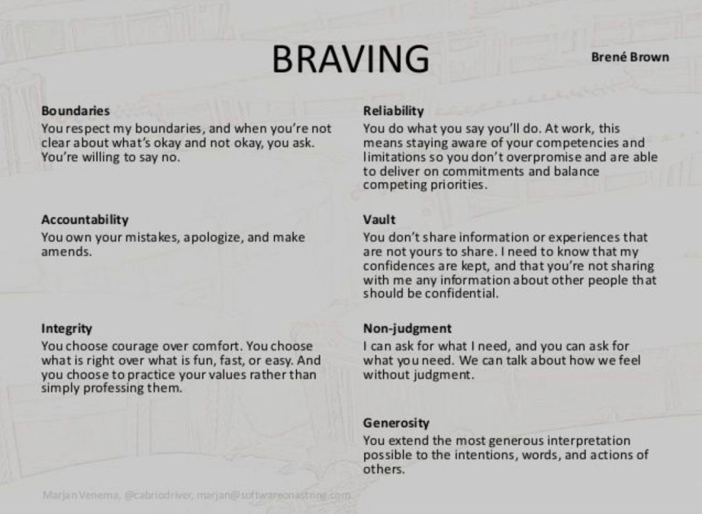 Brene Brown says that when we trust, we are braving connection with someone. She developed the acronym ‘BRAVING” to help us remember the elements that are the anatomy of trust: Boundaries, Reliability, Accountability, Vault, Integrity, Non-Judgment and Generosity.